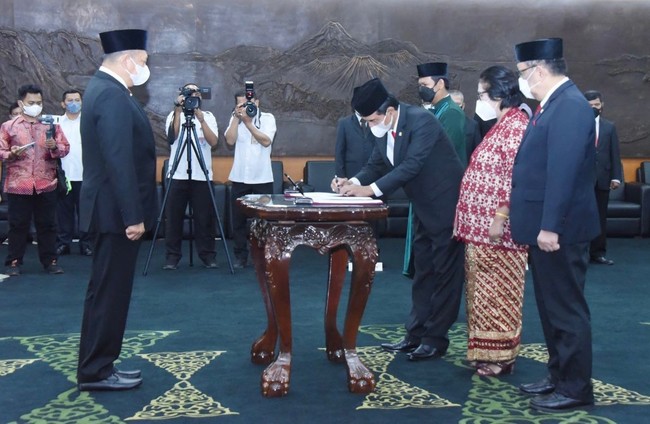Ketua MPR RI Bambang Soesatyo melantik anggota MPR RI Pengganti Antar Waktu (PAW) di Komplek Parlemen Jakarta, Senin (20/12/2021). Ia mengajak para anggota MPR PAW untuk ikut membumikan 4 Pilar MPR RI.