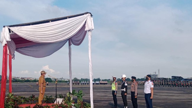 Apel digelar di Lanud Soewondo, Medan, Kamis (23/12/2021). Edy Rahmayadi menjadi pemimpin dalam apel ini. Apel dihadiri Kapolda Sumut Irjen RZ Panca Putra Simanjuntak dan Pangdam I/BB Mayjen Hasanuddin.