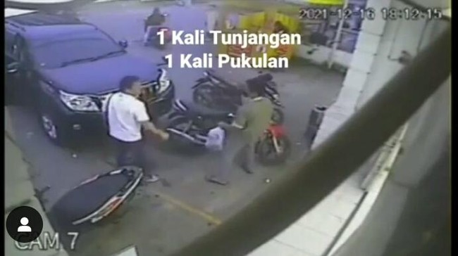 "Informasi yang beredar pengendara roda empat tidak terima kendaraannya untuk mundur agar kendaraan roda dua bisa keluar. Terlihat jelas dari CCTV mobil yang masuk menyenggol sepeda motor yang parkir," tulis pengunggah.