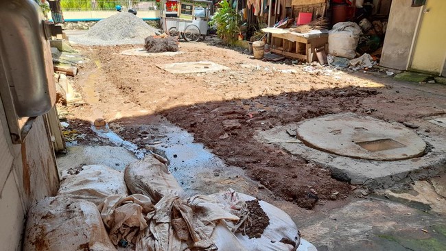 Namun, masih terlihat tumpukan tanah merah di sekitar area sumur resapan. Tak hanya itu, karung-karung dan pasir ditumpuk di dekat sumur resapan.