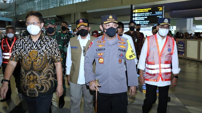 Kapolri Jenderal Listyo Sigit Prabowo hari ini meninjau Bandara Soekarno-Hatta (Soetta) bersama Menteri Kesehatan Budi Gunadi Sadikin, Menteri Perhubungan Budi Karya Sumadi, Kepala BNPB Letjen TNI Suharyanto, dan Kasum TNI Letjen Eko Margiyono. Listyo meninjau langsung prokes terhadap pelaku perjalanan internasional (PPI) yang masuk melalui Bandara Soetta.