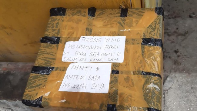 Pada bagian atas kardus, terdapat secarik kertas dengan tulisan 'Tolong yang menemukan paket ini dibuka saja, nanti di dalam ada alamat saya, nanti antar saja ke rumah saya'.