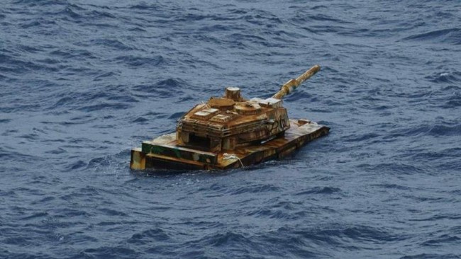 Dalam foto yang dilihat, tampak benda mengapung tersebut mirip seperti tank. Badan benda mirip tank itu berwarna cokelat.