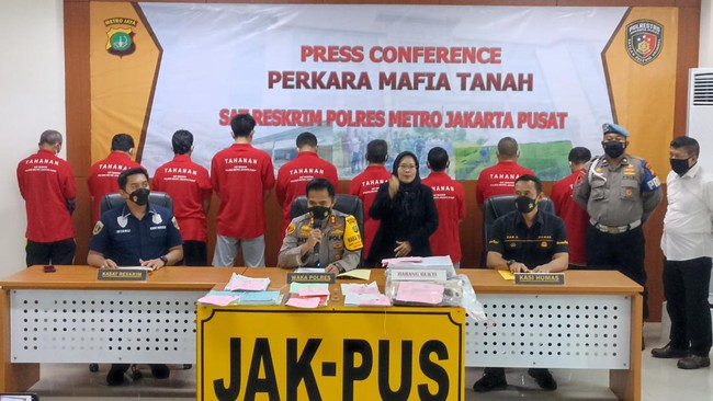 Polres Metro Jakarta Pusat menangkap 10 orang mafia tanah di Serang, Banten. Beberapa yang ditangkap adalah mantan kepala desa dan camat.