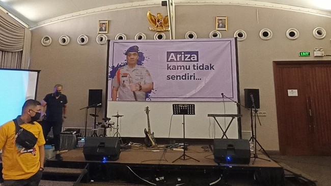 Sebuah backdrop bertulisan 'Ariza Kamu Tidak Sendiri' terpampang di acara Alumni Resimen Mahasiswa (Menwa). Panitia pun memberikan penjelasan.
