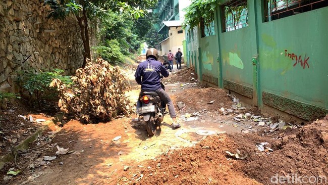 Jalan tersebut berada tepat di belakang SMPN 216 Jakarta Pusat di kawasan kompleks pendidikan Salemba. Terpantau sejumlah pemotor melewati jalan tersebut dengan sangat berhati-hati. Sebab, kondisi kontur jalan yang tidak rata dan bergelombang.