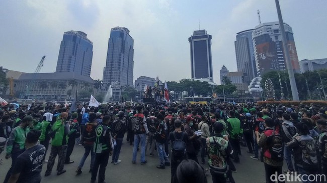 Ribuan ojek online (ojol) dari seluruh Indonesia menggelar aksi di Patung Kuda Arjuna Wijaya, Jakarta Pusat. Mereka menuntut kejelasan payung hukum profesi driver transportasi online.