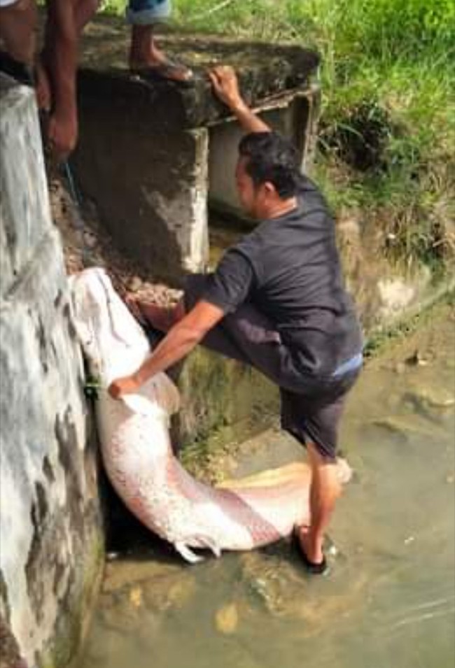 Dalam salah satu foto yang beredar, ikan itu tampak diangkat ke atas dari sebuah saluran. Beberapa pria berusaha menarik ikan dari air.