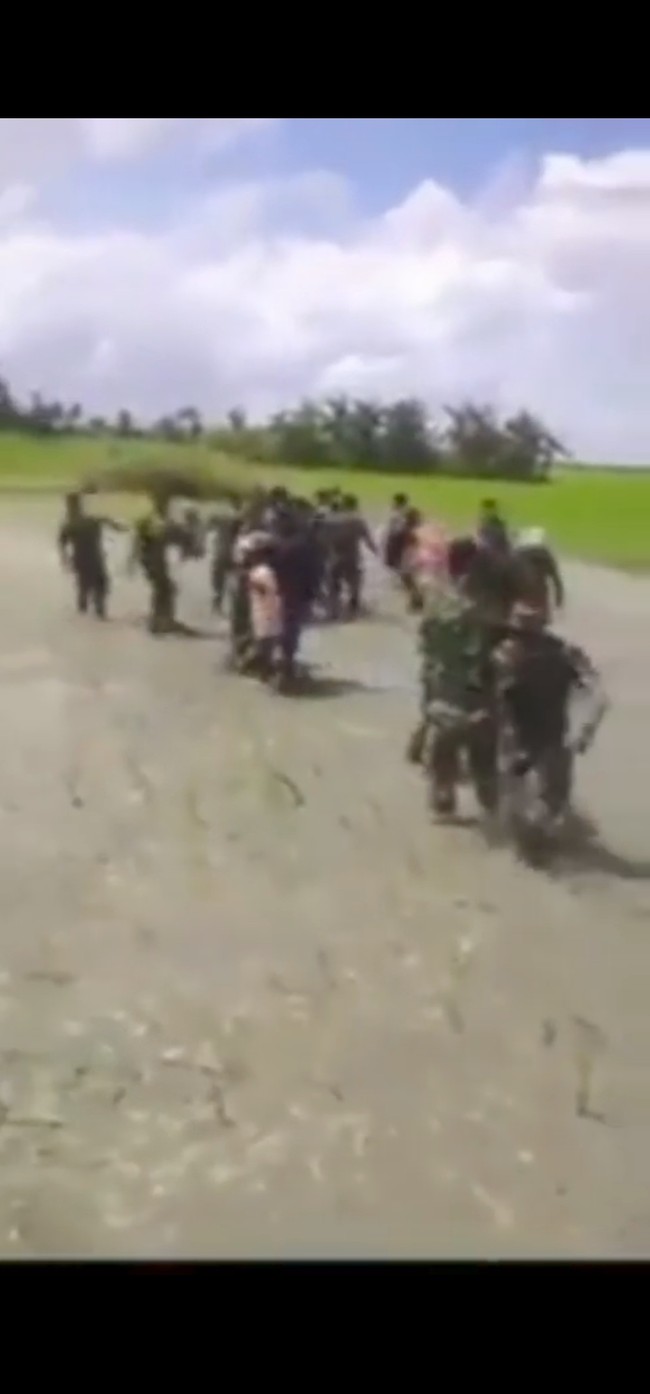 Kemudian terlihat kedua kelompok ini saling kejar dan lempar di tengah sawah. Ada juga aksi saling pukul antara personel TNI dan warga.