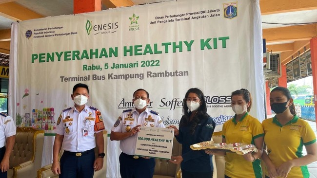 Pada Rabu, (5/1), Head of Public Relation Enesis Group Elkana Lewerisa secara simbolis menyerahkan healthy kit kepada Direktur Jenderal Perhubungan Darat Kementerian Perhubungan RI, Budi Setiyadi didampingi oleh Kepala Dinas Perhubungan DKI Jakarta, Syafrin Liputo di Terminal Kampung Rambutan, Jakarta Timur.