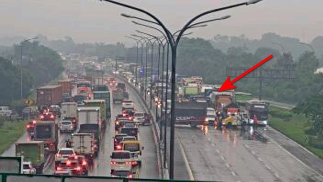 Berdasarkan foto yang diunggah Twitter @PTJASAMARGA, tampak satu unit truk melintang di lajur kanan dan menghalangi kendaraan lain. Antrean kendaraan juga tampak di lokasi kejadian.