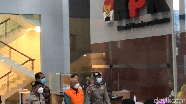 Pantauan detikcom, pukul 17.40 WIB, Kamis (6/1/2022), Pepen terlihat mengenakan rompi tahanan KPK berwarna oranye dengan tangan terborgol. Dia berjalan menuju ruangan konferensi pers untuk diumumkan status tersangkanya.