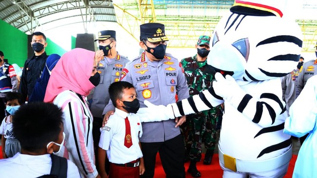 Kapolri Jenderal Listyo Sigit Prabowo menghadiri acara vaksinasi serentak di Gedung Dome Bale Rame, Kabupaten Bandung, Jawa Barat. Dalam acara itu, Sigit bicara mengenai syarat berlangsungnya pertemuan tatap muka (PTM) 100 persen di sekolah.