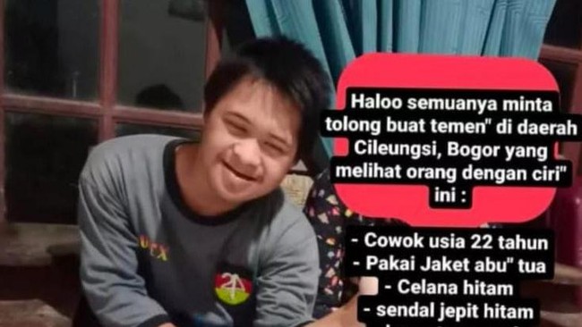 Pria bernama Asrofi Nur Bangi (Tejo) dilaporkan hilang di Bogor, Jawa Barat. Pria berumur 22 tahun itu berasal dari Yogyakarta.