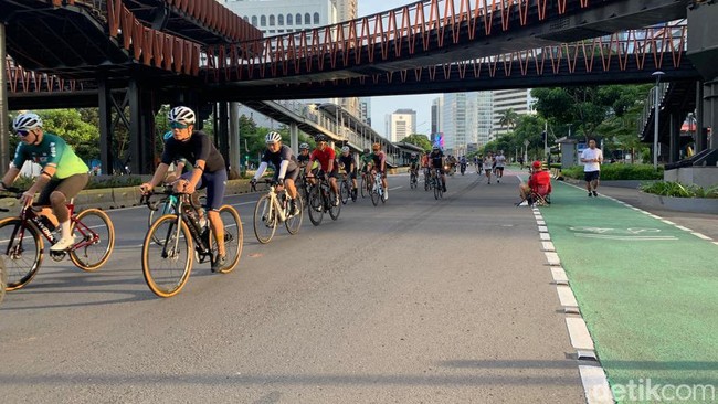 Pantauan detikcom, Minggu (9/1/2022) pukul 07.30 WIB, terlihat ramai pesepeda gowes di luar jalur sepeda Sudirman-Thamrin, tepatnya di bawah jembatan penyeberangan Sudirman yang masih dalam tahap pembangunan. Mereka masuk ke jalur umum yang merupakan jalur bagi kendaraan bermotor dan bermobil.