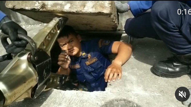 Petugas juga keluar melalui sela-sela selokan yang sempit. Bahkan, ketika keluar dari selokan petugas dibantu menggunakan alat untuk membuka beton selokan tersebut.