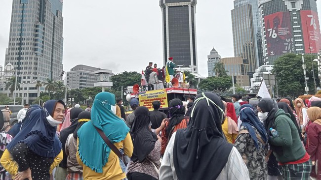 Massa yang menamakan diri Forum Umat Muslim Indonesia (FUMI) menggelar demonstrasi di Patung Kuda, Jakarta Pusat. Massa FUMI meminta Majelis Ulama Indonesia (MUI) segera mencabut persetujuan penggunaan vaksin Corona atau COVID-19 nonhalal.