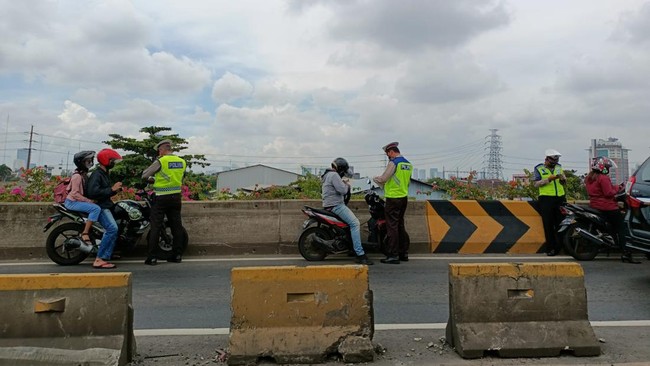 Polisi menilang sejumlah pengendara motor yang nekat melintas di flyover Pesing, Jakarta Barat. Beberapa di antaranya mengaku tidak melihat rambu-rambu adanya larangan motor melintas di flyover Pesing.