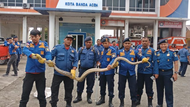 "Ular masuk ke halaman rumah milik Yahli (60) yang beralamat di samping pabrik tahu di Desa Punge Blang Cut perbatasan Kecamatan Banda Raya Kota Banda Aceh," kata Plt. Kepala Dinas Pemadam Kebakaran dan Penyelamatan (DPKP) Kota Banda Aceh Heru Triwijanarko kepada wartawan, Senin (10/1/2022).