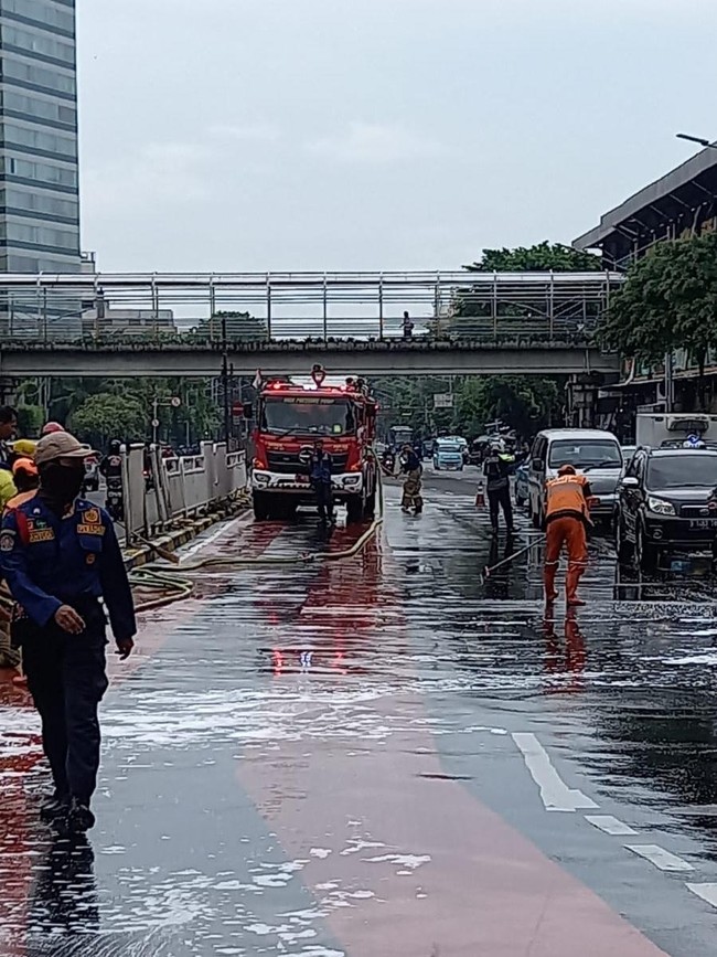 Kepala Suku Dinas (Kasudin) Gulkarmat Jakpus, Asri Rizal, mengatakan petugas sudah mulai membersihkan tumpahan oli tersebut sejak pukul 07.05 WIB pagi tadi.