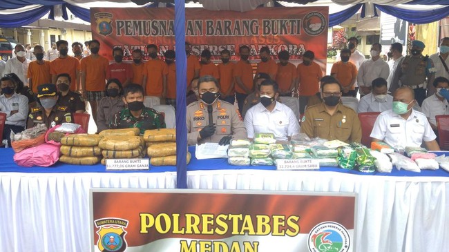 "Memusnahkan barang bukti narkotika sebanyak 33 kg sabu, 19 kg ganja, dan 12.776 butir ekstasi. Ini didapatkan dari penindakan bulan 11 dan 12 tahun 2021 serta penangkapan awal tahun kemarin," kata Kapolrestabes Medan Kombes Riko Sunarko, Selasa (11/1/2022).