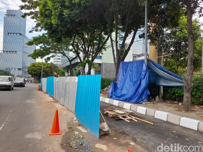 Tenda para pekerja pun masih berada di sekitar lokasi pengerjaan proyek galian tersebut. Pembatas jalan berupa kerucut oranye terpasang di dekat Kantor Dinas Pendidikan DKI Jakarta. Di bagian lokasi pengerjaan, tampak bekas galian sudah terisi air sisa hujan.