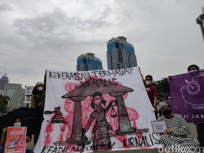 Hal itu disampaikan dalam aksi unjuk rasa yang digelar di dekat Patung Kuda, Monas, Jakarta Pusat (Jakpus). Ketua AJI Jakarta, Afwan Purwanto, mengatakan aksi ini digelar sebagai bentuk pengawalan agar keadilan ditegakkan.