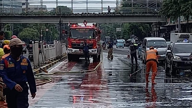 Asri mengatakan saat itu pihaknya mengerahkan 1 mobil pemadam kebakaran dan 8 personel untuk membersihkan tumpahan oli tersebut. Proses pembersihan dengan air dan sabun pun baru selesai sekitar pukul 09.00 WIB.