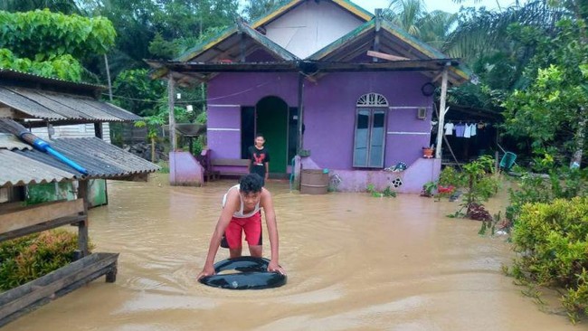 Dilansir dari Antara, Kamis (13/1/2022), banjir merendam wilayah di Desa Karang Jinawi, Kecamatan Sepaku, Penajam Paser Utara. Banjir terjadi pada Rabu (12/1) akibat hujan deras.