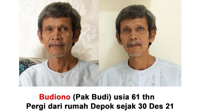 Budiono (61) warga asal Depok, Jawa Barat, sudah 15 hari hilang. Budiono merupakan penderita demensia.