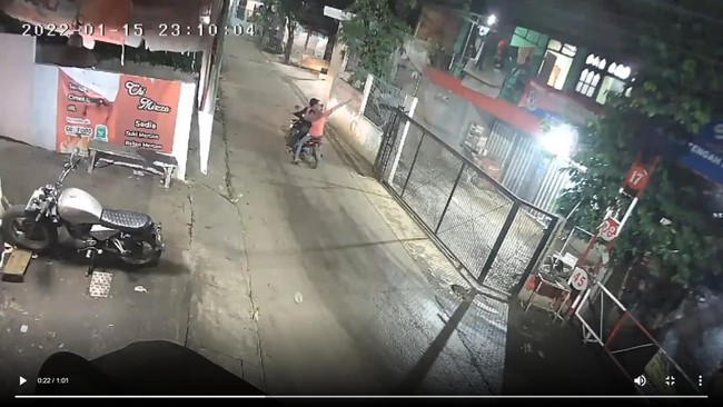 Dalam video berdurasi 1 menit 1 detik itu, terlihat awalnya ada dua orang yang sedang berboncengan berhenti di depan portal. Salah satunya tampak ingin membuka portal supaya motornya bisa lewat.