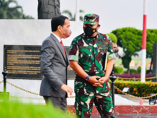 Kemudian ada foto lain yang menunjukkan Jokowi sedang mengobrol bersama Letjen Joni. Letjen Joni tampak menyimak omongan Jokowi.