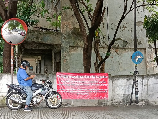Selain itu, Joko menyebut ketegangan soal pemilihan ketua RW 03 sudah mereda. Spanduk 'Mosi Tidak Percaya' yang sempat dipasang telah diturunkan oleh pihak Kelurahan Jelambar.