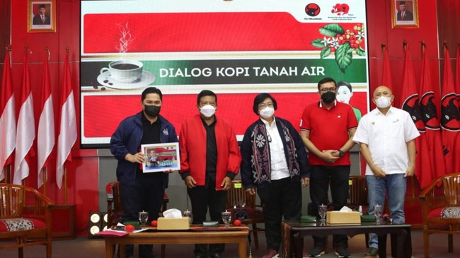 PDIP menggelar diskusi bertajuk 'Kopi Tanah Air' yang menghadirkan beberapa menteri kabinet. Menteri yang hadir yakni Menteri BUMN Erick Thohir, Menteri Koperasi dan UKM Teten Masduki, serta Menteri Kehutanan dan Lingkungan Hidup Siti Nurbaya.