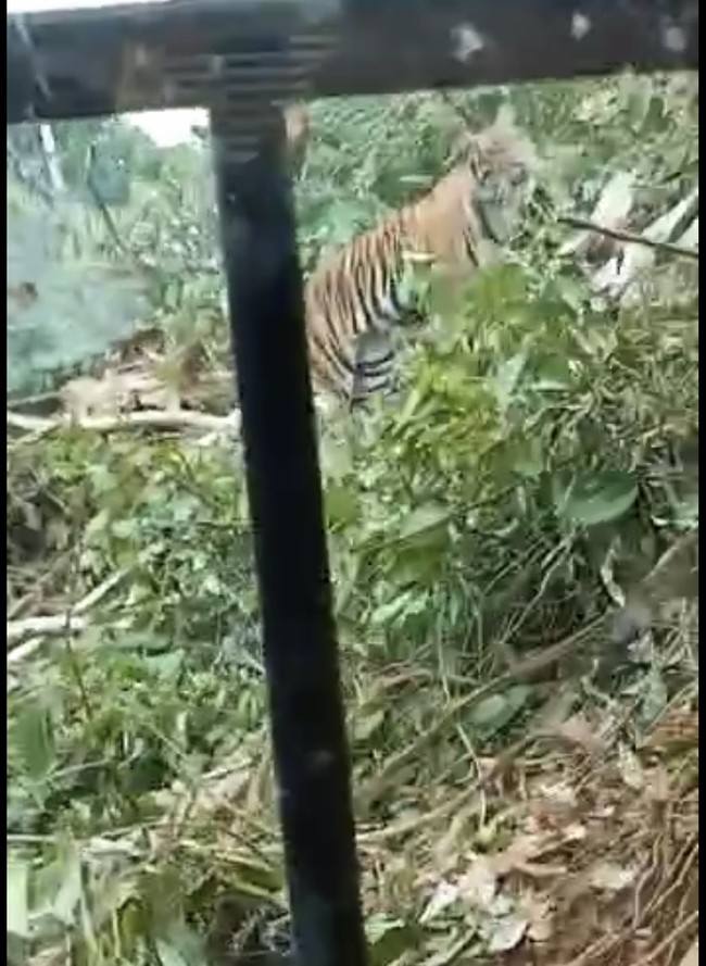 Video kemunculan harimau Sumatera itu beredar luas di media sosial. Diperkirakan, video direkam sendiri oleh pekerja yang mengoperasikan alat berat tersebut.