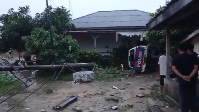 Di sana juga terlihat lampu beberapa rumah warga masih hidup, beberapa pohon dan tiang listrik terlihat tumbang diduga akibat dihantam mobil tersebut.