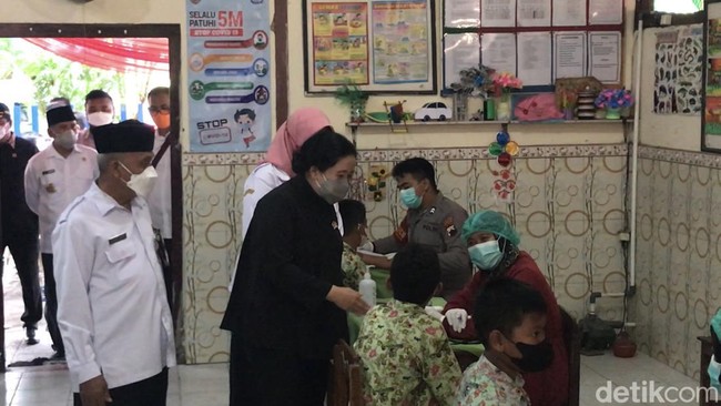 Usai dari bandara, Puan bersama Gibran meninjau gelaran vaksinasi siswa di SD Negeri 1 Sawahan, Kecamatan Ngemplak, Boyolali, Jawa Tengah. Pantauan di lokasi pukul 10.50 WIB, keduanya berbincang dan membagikan alat tulis kepada siswa di sana.