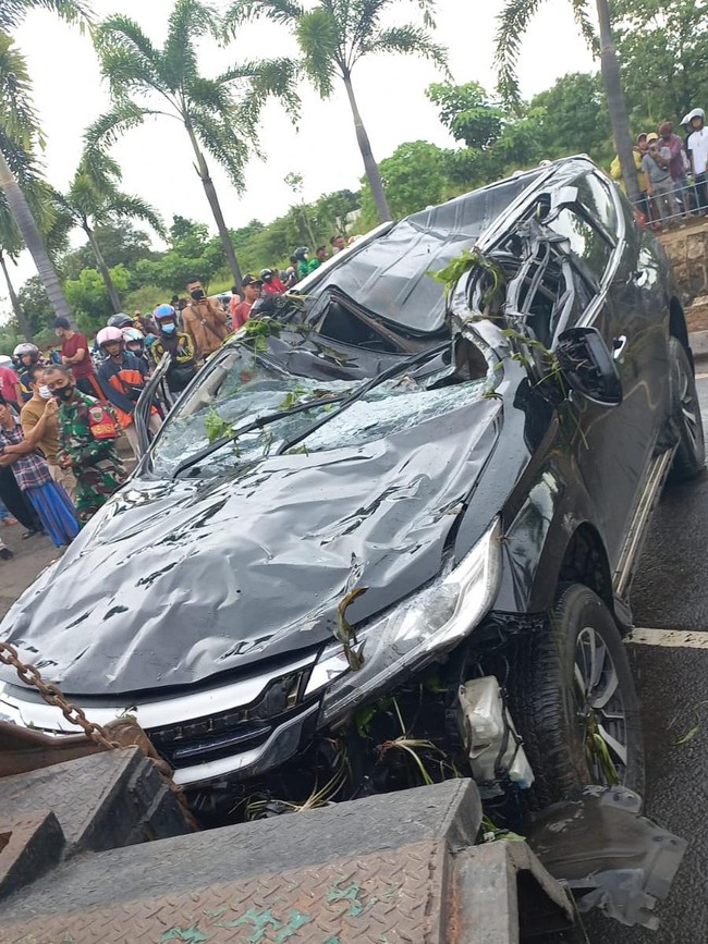 Kendaraan korban terbalik. Mobil Pajero tersebut ringsek parah. Korban yang berada di dalam mobil kemudian dievakuasi oleh petugas.
