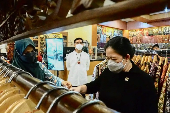 Ketua DPR RI Puan Maharani mengunjungi Kampung Batik di Pasar Laweyan, Solo didampingi Wali Kota Surakarta Gibran Rakabuming Raka, Kamis (20/1). Puan bertemu dan berdialog dengan para pengrajin batik di Pasar Laweyan.