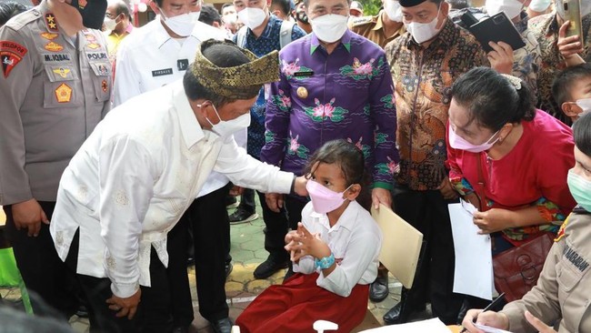 Menteri Dalam Negeri (Mendagri) Muhammad Tito Karnavian bersama Wali Kota Pekanbaru Firdaus meninjau pelaksanaan vaksinasi anak di SDN 36 Pekanbaru. Kunjungan ini bertujuan untuk mengingatkan semua pihak di Pekanbaru agar program vaksinasi dipercepat dan protokol kesehatan tetap dijalankan.