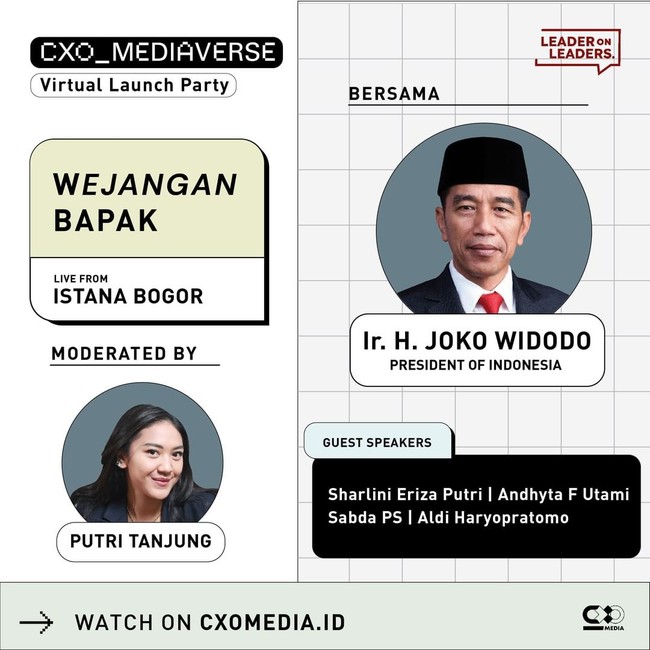 Kali ini, Presiden RI Joko Widodo akan berbincang soal pembangunan bangsa secara eksklusif bersama Founder & CEO of CXO Media, Putri Tanjung di acara CXO Mediaverse. Ditayangkan dari Istana Bogor, dalam obrolan 'Wejangan Bapak', Jokowi akan memberikan sedikit nasehat tentang pembangunan bangsa Indonesia.