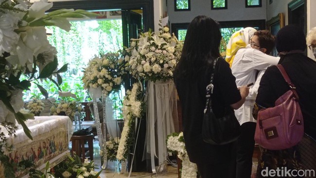 Terlihat karangan bunga nampak membanjiri di depan rumah duka. Karangan bunga itu dikirim dari beberapa tokoh dan pejabat di Tanah Air.