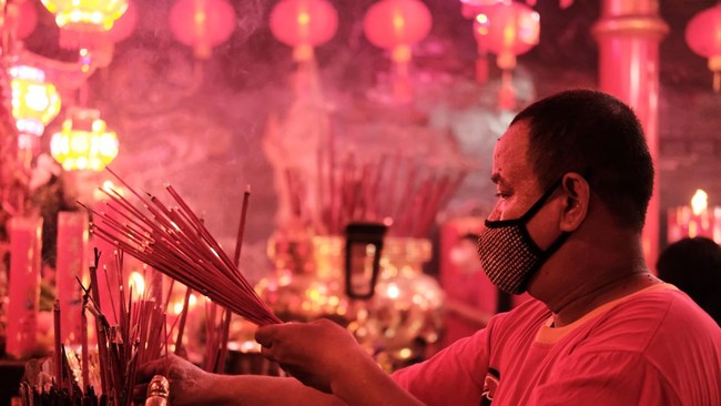 Jumlah jemaat yang melakukan sembahyang tahun baru Imlek 2573 di Klenteng Hok Lay Kiong, Bekasi menurun. Malam ini jumlahnya turun mencapai 50 persen jika dibandingkan sebelum pandemi COVID-19.