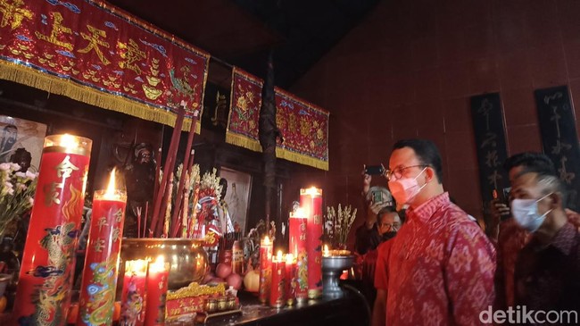 Setiba di lokasi, Anies langsung menyapa pengurus kelenteng dan warga sekitar. Dia memakai batik bernuansa merah dan celana panjang hitam.
