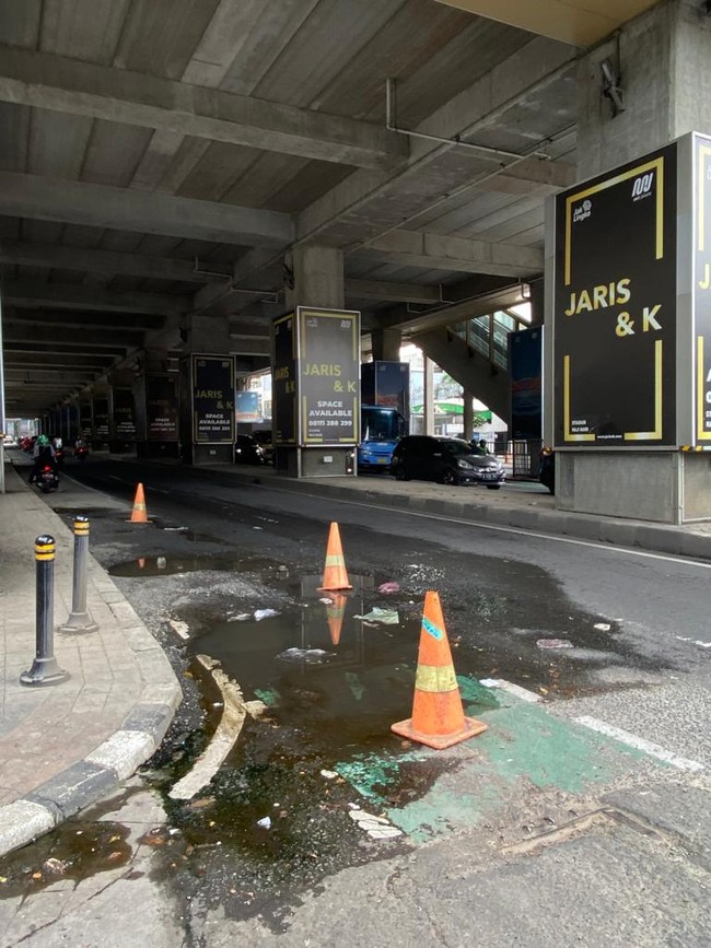 Terlihat tepat di jalur sepeda jalan di bawah kolong Stasiun MRT ini, air menggenangi permukaan jalan yang rusak. Ada tiga corong kerucut dipasang agar pengendara tidak terperosok celaka di lubang ini. Soalnya, lubang jalan memang tersamar oleh genangan.