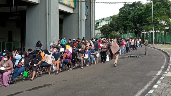 Pantauan detikcom, Sabtu (5/2/2022), pukul 09.42 WIB, terlihat antrean panjang masyarakat yang akan melakukan vaksin booster. Warga harus sabar menunggu giliran mendapat booster. Vaksinasi booster massal kali ini merupakan kerja sama antara Dinkes Bekasi dan Badan Intelijen Negara (BIN).