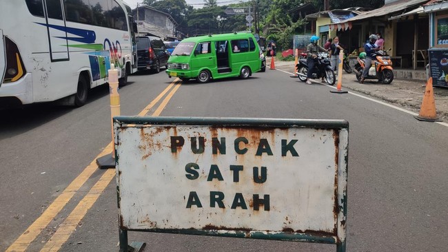 One way arah Jakarta diberlakukan di Jalan Raya Puncak, Kabupaten Bogor. Salah satu titik pengalihan arus ada di Simpang Gadog.