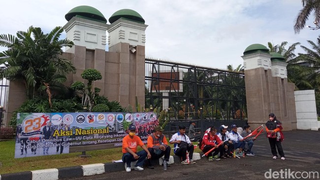Massa aksi pun terdiri atas Partai Buruh yang menggunakan baju berwarna oranye dan buruh yang menggunakan kemeja putih berpadu biru. Massa aksi masih belum melakukan gelaran demo.