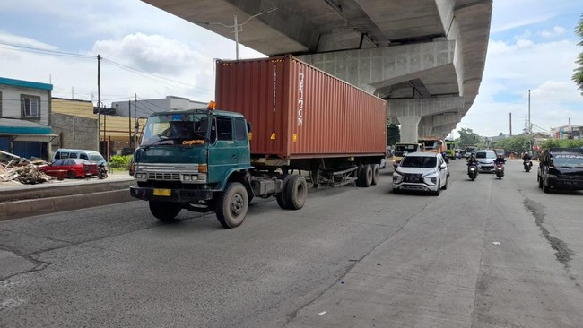Pantauan di lokasi, Senin (7/2/2022), pukul 14.30 WIB, lalin di sekitar JPO Tipar Cakung ramai. Khususnya truk-truk kontainer sering terlihat di lokasi.