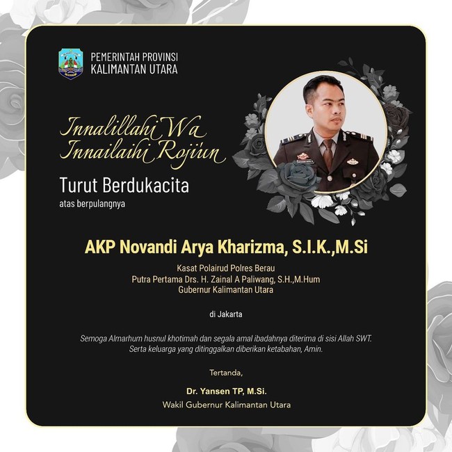 "Innalillahi Wa Innailaihi Rojiun. Jajaran Pemprov Kalimantan Utara mengucapkan duka cita atas berpulangnya AKP Novandi Arya Kharizma, S.I.K., M.Si, Putra Gubernur Kalimantan Utara, Drs. H. Zainal A Paliwang, S.H.,M.Hum di Jakarta," demikian keterangan di postingan @kaltaraprov, Selasa (8/2).